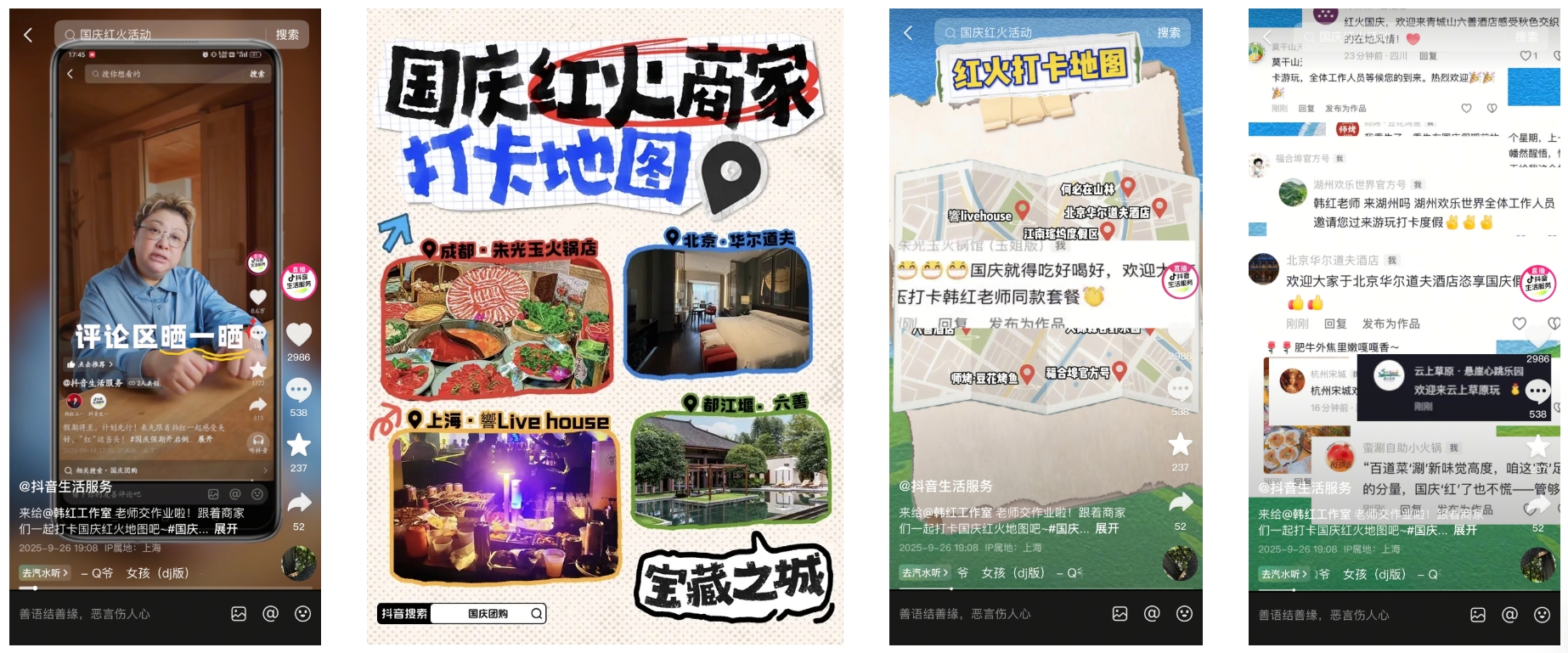 在活动众多的国庆假期,抖音生活服务以明星营销作为突破口,通过契合假日消费场景的内容共创,吸引更多用户主动参与到活动中,打卡下单的同时,在平台中分享给更多人,最终形成热闹的“内容场”,其中真实可信的“自来水”推荐,又让各类吃喝玩乐“红店”成为用户的自然选择,帮商家在假期迎来生意爆发。
