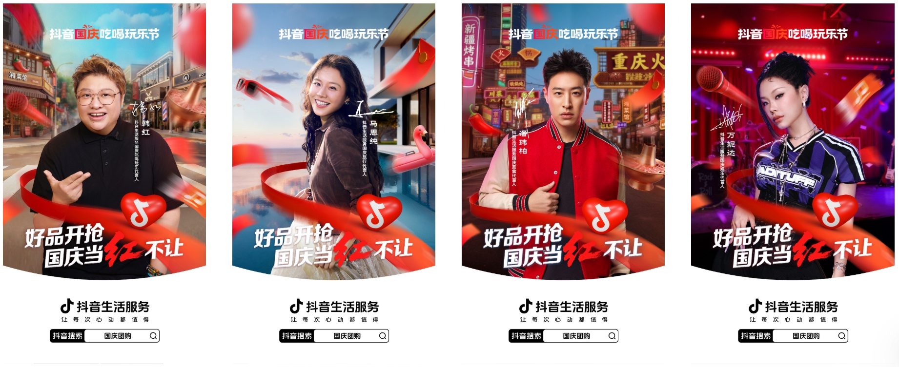 9月19日,抖音生活服务邀请国庆代言人韩红、国庆品类代言人马思纯、潘玮柏、万妮达共同组成“分红天团”,四位代言人聚焦假期吃喝玩乐等高频消费场景,共创探店体验等优质内容,为用户提供更多假日新灵感的同时,关联带动地方宝藏小店。