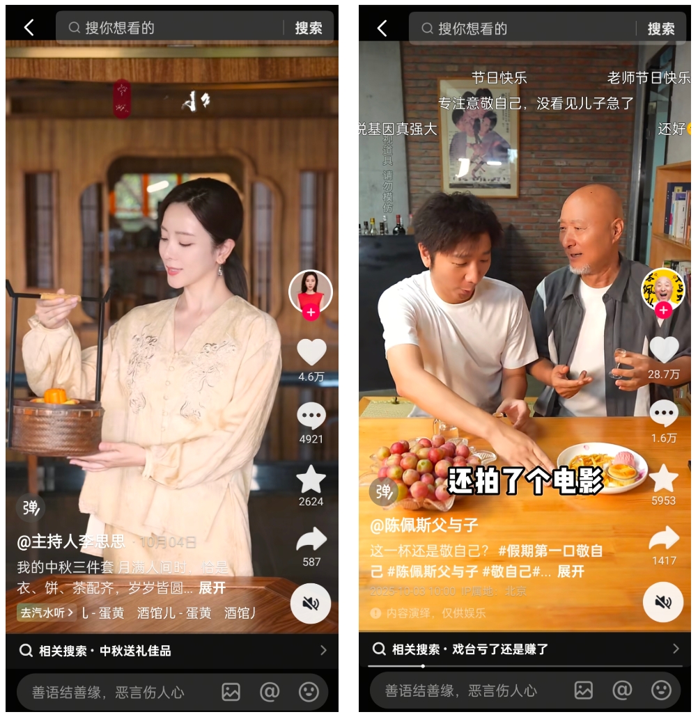 除了根据不同节点的主流需求打造话题股海策略,抖音生活服务还通过发掘假期消费潜力品类,打造垂类热点,带用户找到新的假期生活灵感。活动围绕「国庆给生活分点红」、「一人推荐一道C位湘菜」、「去livehouse拍人生照片」等热点话题,联动达人展开特色品类营销,@陈佩斯父与子 过节小酌,父子俩对话秒变小品现场;@主持人李思思 穿新中式套装、品茗吃月饼,展示中式美学和传统文化的结合。在达人带动下,话题#国庆小城正当红 最高登录全国榜TOP1,小城旅游、湘菜等品类热度持续走高,助力更多特色品类商家“红”出圈。