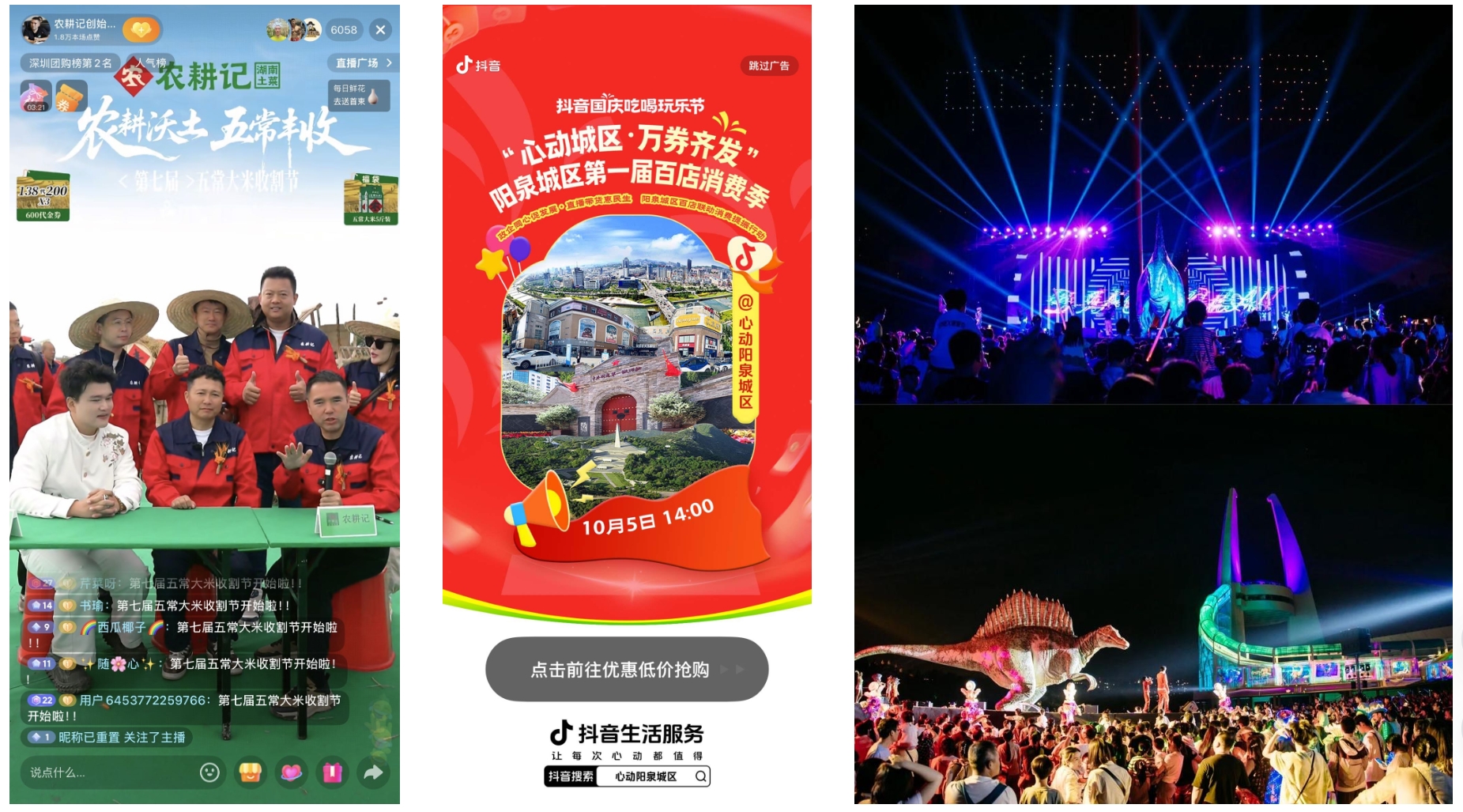 其中,农耕记湖南土菜首创“稻田户外”直播,通过“创始人收稻+非遗表演”的形式,带用户走进品牌的真实原产地,创新直播形式,也拉动了观看量的飙升,成为深圳地方菜榜的TOP1;不止餐饮,综合类目商家也在假期期间玩出花,山西优选联合阳泉市城区人民政府、城区商务局进行“心动阳泉城区”IP打造,针对5大品类创新自组城市通兑券,搭建城市直播间进行售卖,国庆期间跑通累计80万+通兑运营模式;同时兼顾国庆出行需求,酒旅类商家依托平台玩法资源,放大园区游玩项目优势,常州中华恐龙园迎合国庆氛围打造超百场演艺,上千位NPC互动释放吸引用户入园,通过抖音短视频扩散传播,提升园区假期声量,10月1日至5日抖音团购订单量环比增长超120%。