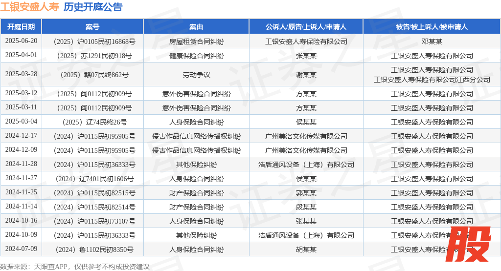 案号:(2025)沪0105民初16868号审理法院:上海市长宁区人民法院案由:房屋租赁合同纠纷当事人信息: 原告/上诉人:工银安盛人寿保险有限公司 被告/被上诉人:邓某某开庭日期:2025年6月20日根据统计,近一年内以工银安盛人寿保险有限公司为当事人的历史开庭公告有15则,其中案由为“人身保险合同纠纷”的公告以4则居首,其次为“侵害作品信息网络传播权纠纷”有2则,“其他保险纠纷”有2则。历史开庭公告如下: