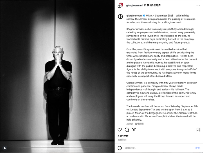 “阿玛尼怀着无限悲痛宣布其缔造者、创始人及不懈推动者乔治·阿玛尼的逝世,直至生命的最后一刻,他仍全心投入公司事务、系列设计及未来项目的筹备。” 据悉,遵照阿玛尼先生的意愿,葬礼将以私人形式举行。