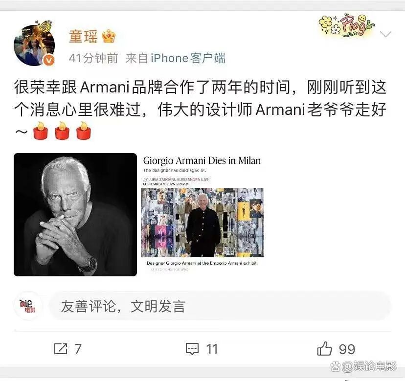 也是巧合,长得很像章子怡的童瑶也发文悼念阿玛尼,表示很荣幸跟品牌合作了两年的时间,刚刚听到这个消息心里很难过,伟大设计师阿玛尼老爷爷走好。